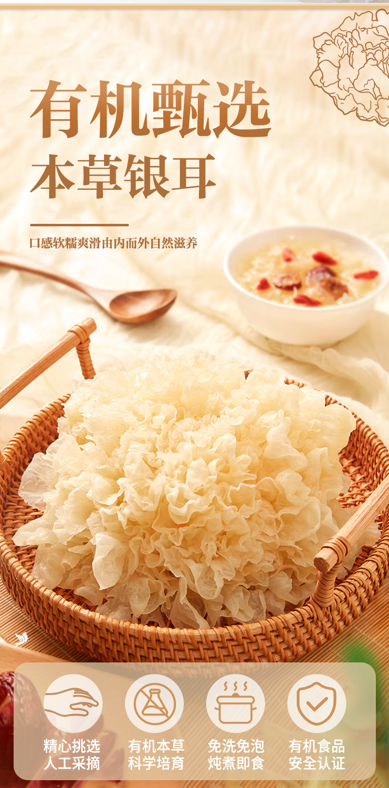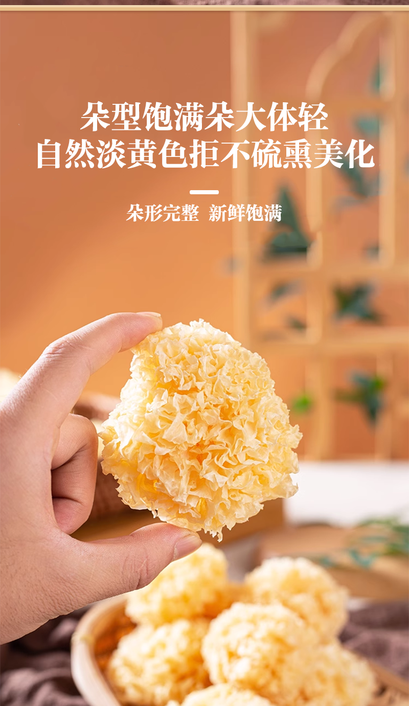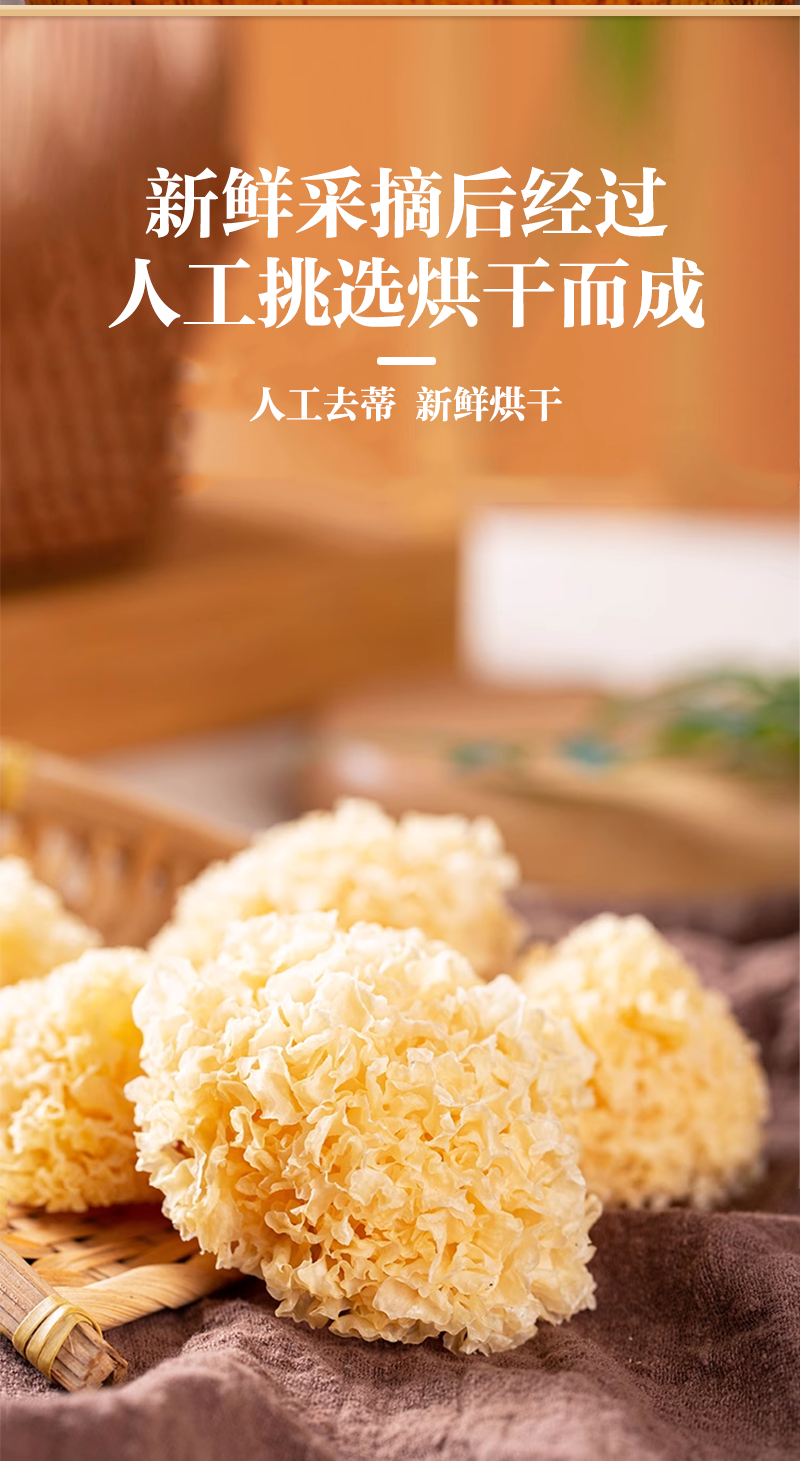 猜你喜欢 福建 竹荪|新鲜采摘 朵朵甄选 浓郁菇香 食补好物 营养健康|原色无沙无熏硫 2袋装 ¥35.9¥49.9 购买 长白山有机黑木耳|深山生长 肥厚鲜美 色泽鲜亮 朵型完整 高泡发率|三袋装 ¥39.9¥59.9 购买 有机甄选干银耳卜鲜味营养 快速出胶 软糯温润 嫩滑软绵 朵型完整|有机认证 0防腐 不熏硫 30克/袋 6送1袋 ¥42.9¥59.9 购买 正宗攸县 鲜香干|匠心工艺 手工纯制 豆香浓郁 劲道爽口传承美食|5袋装x238克 保鲜箱配送 ¥27.9¥39.9 购买 高安腐竹干货-非转基因 口感纯正 久煮不烂 批文专利 地理标识-每袋净含300克 买一送一 到手两袋装 ¥28.80¥47.80 购买 七彩菌汤包-十种山珍食材配比 无硫熏 无色素 无添加-两袋装/160克 ¥33.90¥49.90 购买 纸皮原味生核桃-原色果香 果仁饱满 手捏即开-大果仁420克 两袋装 ¥19.90¥39.90 购买 【特级】新疆吊干灰枣可免洗-15袋独立小包 整箱3斤装 ¥48.90¥80.90 购买
