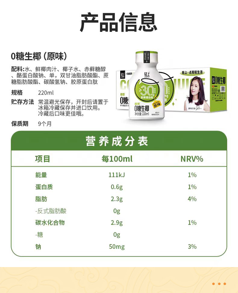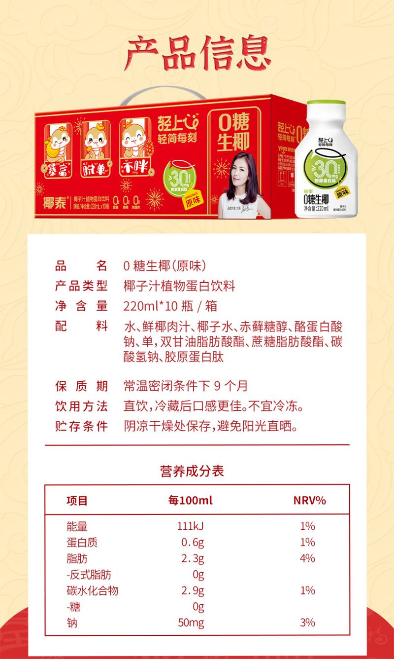 猜你喜欢 零糖生椰汁水|营养丰富 胶原蛋白 清爽畅饮 椰香浓郁原味锁鲜|220mIx10瓶装/箱 ¥28.9¥36.9 购买 零糖生椰汁水丨营养丰富 胶原蛋白 清爽畅饮 椰香浓郁 原味锁鲜丨220ml×10瓶/箱 ¥28.90¥36.90 购买 有机沙棘原浆-低温破壁 鲜果萃取 拒绝添加 滴滴天然 维C满满-一物一码可溯源 500ml/十瓶 盒装 ¥59¥165 购买