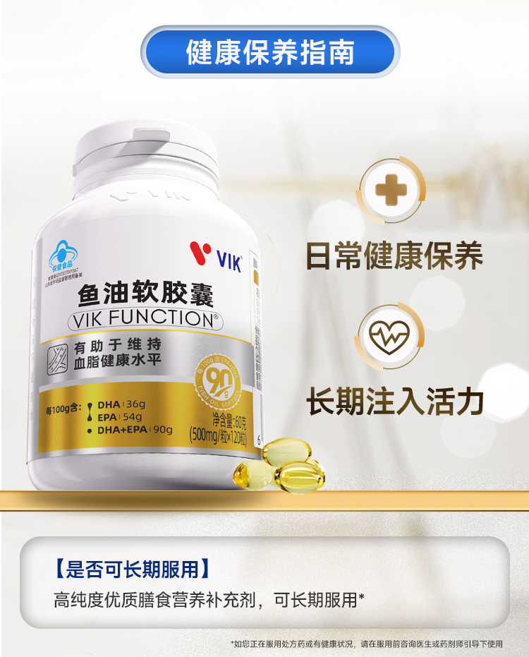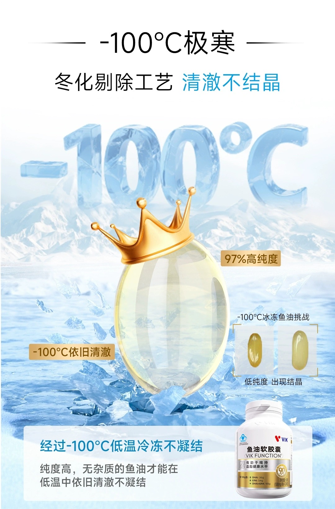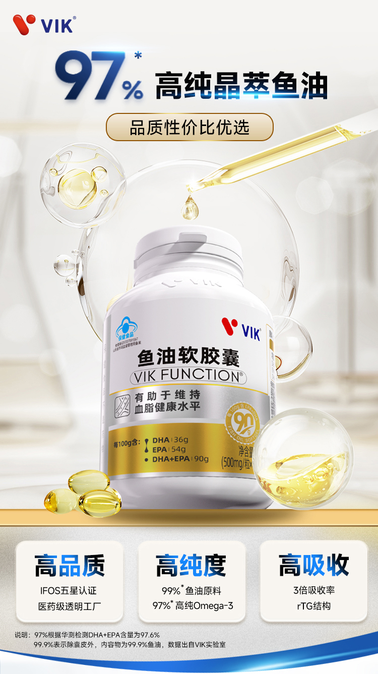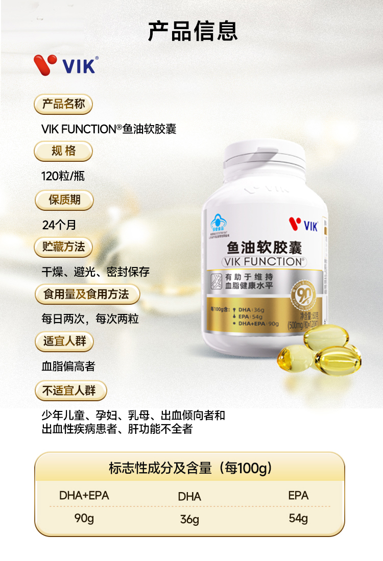VIK高纯鱼油软胶囊|血脂健康大脑营养浓缩吸收蓝帽认证五星标准|120粒瓶装